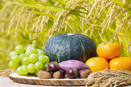 秋の食材と収穫間近の稲穂 ストックフォトの定額制ペイレスイメージズ